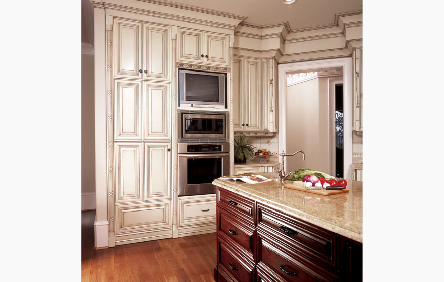 French Lite doors with 945 mullions and Appliance Panels were used. Corbel Acanthus B (8078) can achieve a similar look.