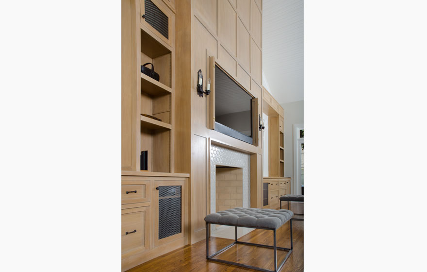 Wainscot Paneling was used as well as Glass Doors where the customer added in metal inserts for media cabinets.
