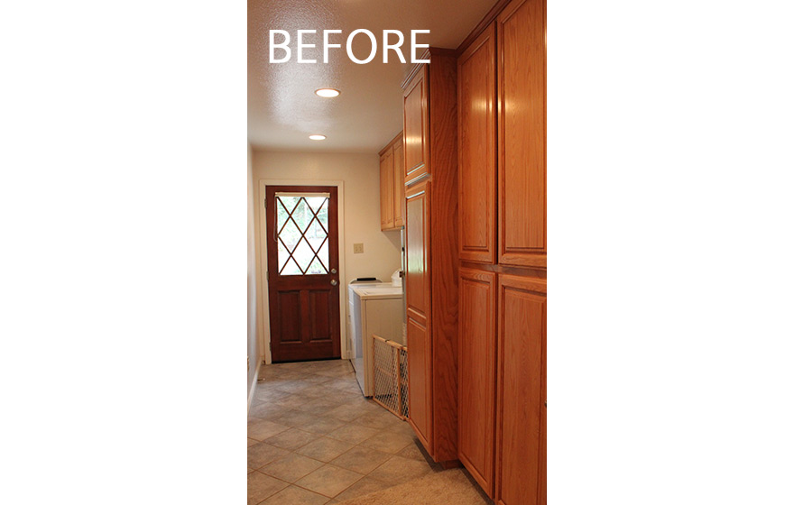 Custom, vented cabinet surround built around water heater in the adjoining pantry / laundry area.